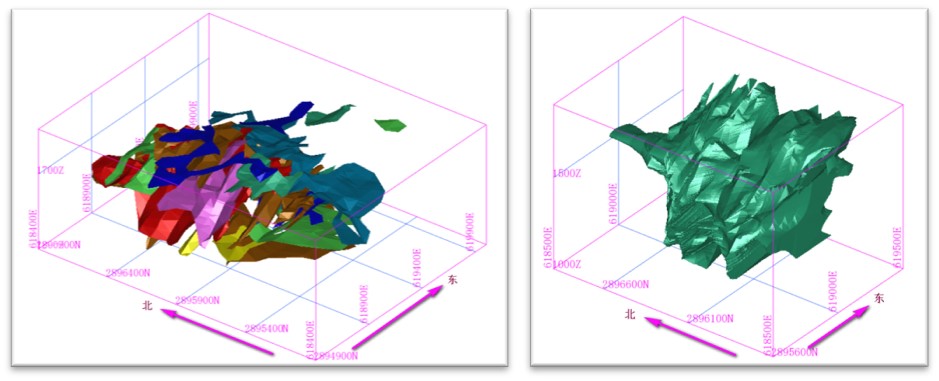 在项目组共同努力下,完成了50条复杂矿体的三维建模,使用宏命令批量化对几十条矿体进行统计分析与储量估值,完成相关图件与文字报告制作,并成功提交五期勘查和矿山储量核实报告,大幅加快北衙金矿数字化建设进程。