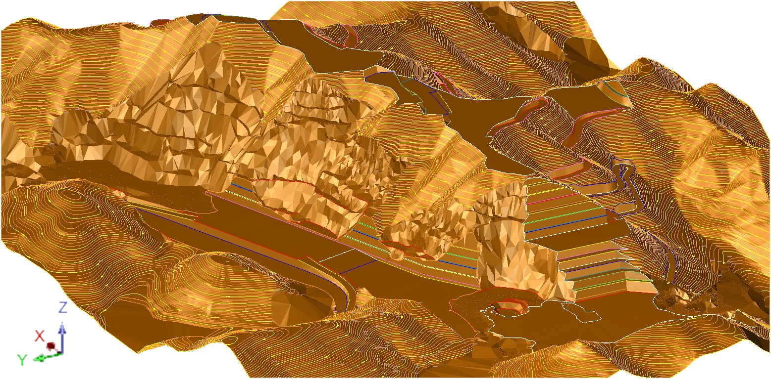 2.针对生产需求,在生产地质及时跟进的基础上,设计采掘条带、台阶斜坡道、出入沟、外围运输道路等。