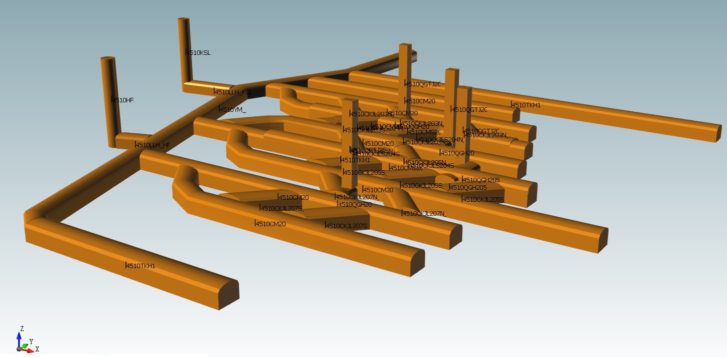 1.根据地质资源模型,结合工程水文地质条件、对整个地采矿做开拓设计,形成三维巷道实体。
